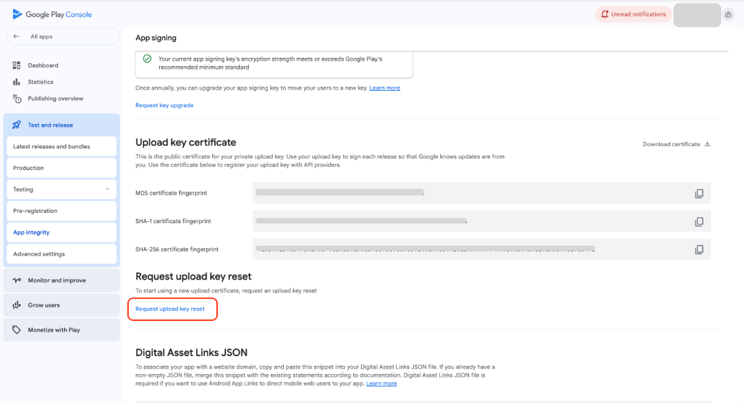 - Click on the app for which you wish to upgrade/reset the upload key.