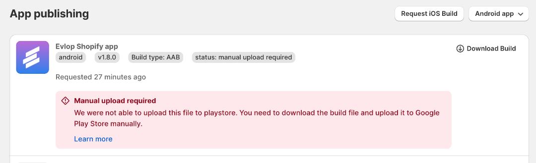 If you see an error❗ message labeled Manual upload required while trying to request an app to the Play Store from Evlop's Shopify Dashboard (Build and upload to Play Store), it could be due to a few conditions.